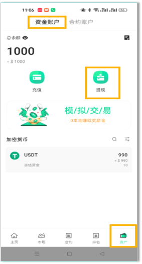 (1)进入【资产】页面,选择【资金账户】,点击【提现】