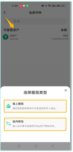 (2) 选择您可提现资产【USDT】,选择提现类型【链上提现】或【站内转账】