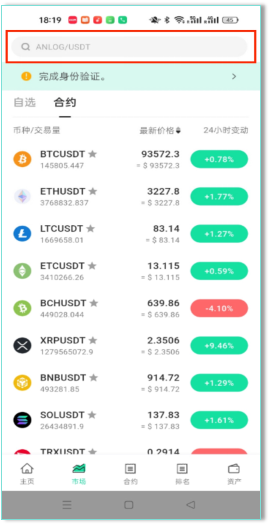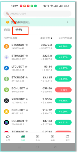 (2)点击—【合约】浏览经过验证的代币,查看自选代币和市场代币实时价格更新。