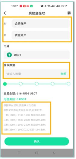 您可将奖励金从合约账户提取至资金账户,输入您的提取金额,点击【确认】即可提取成功